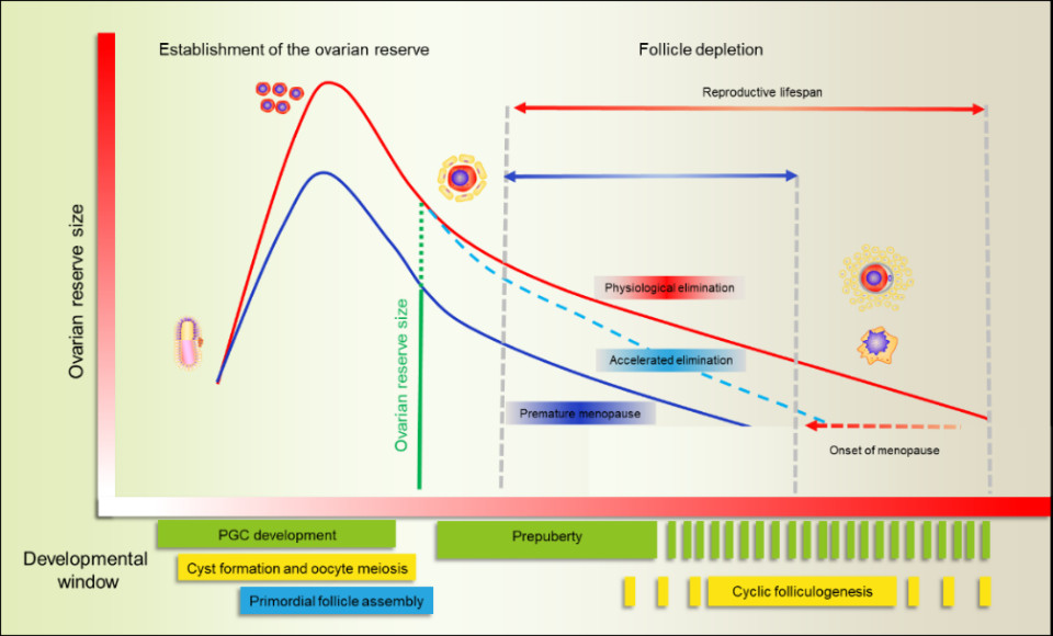 环境化合物影响雌性卵泡库建立、诱发卵巢储备耗竭的示意图