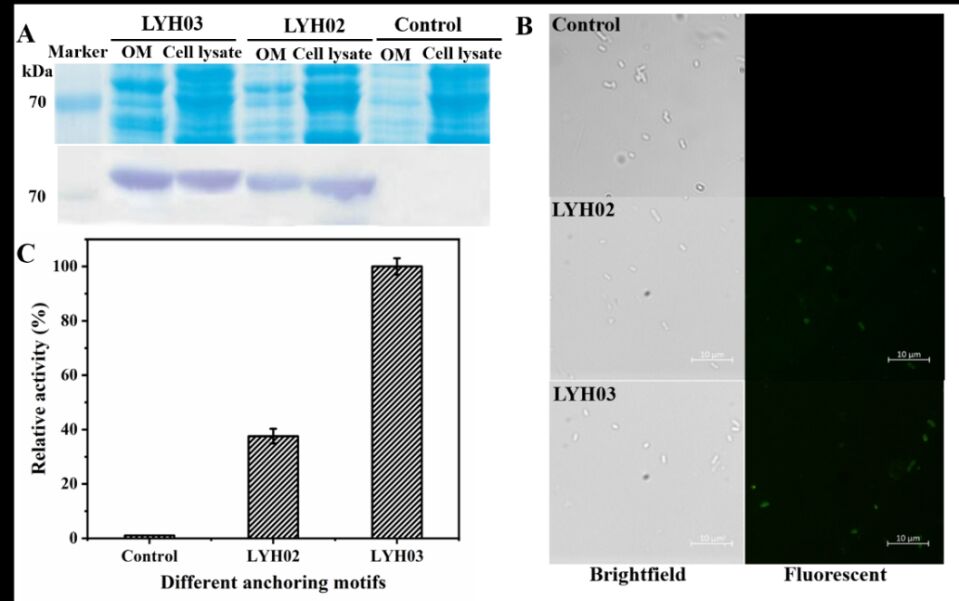 Fig. 2. Evaluation of two cell surface display systems. (A) SDS-PAGE (upper) and Western Blot (under) analysis of outer membrane fraction (OM) and cell lysate of two engineered strains. (B) Confirmation of cell surface-displayed AldDH by immunofluorescence analysis. (C) Relative activity of whole-cell catalyst LYH02 and LYH03.