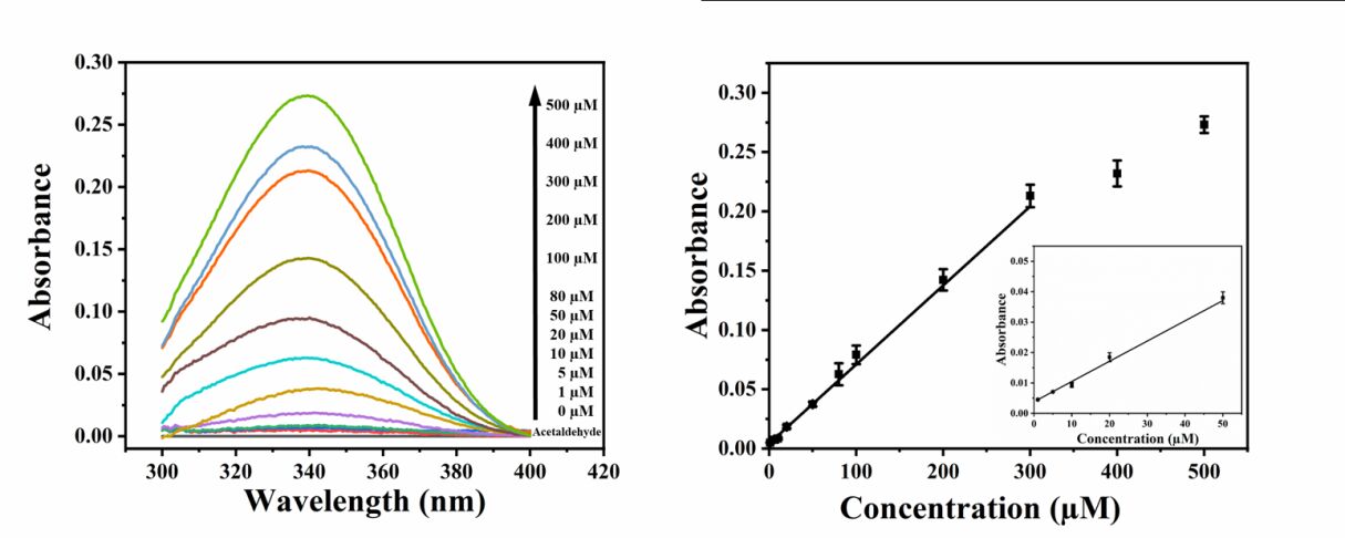 乙醛广泛存在于环境中,尤其是食品和大气中,具有致癌性,对于人类的健康有很大的威胁。因此急需开发一个快速、准确的检测技术。迄今为止,色谱法和传感器常被用于乙醛浓度的检测。色谱法虽然灵敏度高,然而复杂的衍生化前处理程序和漫长的检测过程极大地限制了其在乙醛实时检测中的应用。生物传感器具有操作简单、灵敏度高、稳定性好、性价比高等特点,但目前研发的乙醛生物传感器灵敏度和特异性较差,不能满足实际样品检测的需求。