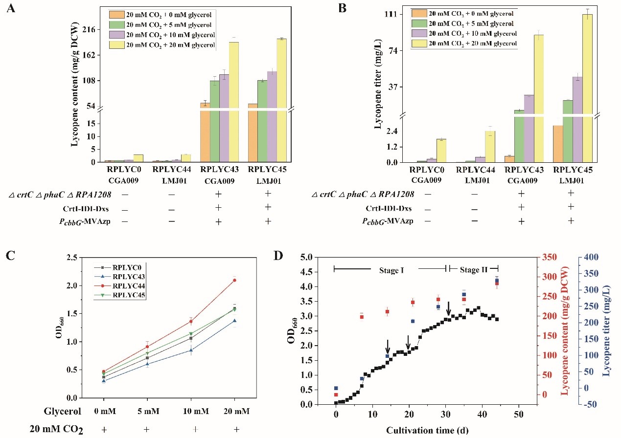 杨建明教授团队利用合成生物学技术成功构建了一种新型的光合细菌——沼泽红假单胞菌平台,直接从CO2和生物柴油的副产物——甘油中直接合成高附加值化合物——番茄红素。首先,采用提高番茄红素生物合成关键酶、MEP途径关键酶和异源MVA途径的表达水平,并敲除竞争途径关键基因等手段,增强番茄红素碳代谢流;其次,通过宿主菌的适应性进化和外源甘油的添加,沼泽红假单胞菌光合自养固定CO2的效率得到极大提高。文中首次证明了甘油同化与CO2生物固定的显著协同效应机制:即甘油降解过程中产生的NADH为CO2的固定提供所需的电子,而甘油产生的磷酸二羟丙酮 (DHAP)有利于1,5-二磷酸核酮(Ru1,5P)的再生,这是Calvin-Benson-Bassham(CBB)循环中的关键步骤。最终的工程菌株RPLYC45在补加甘油及二氧化碳补料分批培养中番茄红素含量达到283.22 mg/gDCW,是原始菌株的87.4倍,这是迄今为止报道的光合细菌利用生物固定CO2合成番茄红素所获得的最高产量。本研究结果表明沼泽红假单胞菌具有很大的潜力被设计成一个以CO2和废甘油为原料的微生物细胞工厂,这个过程比异养微生物(大肠杆菌、酿酒酵母等)中生产番茄红素的生物合成过程更可持续。