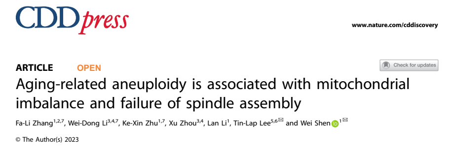近日,细胞生物学权威杂志《Cell Death Discovery》在线发表了77779193永利(中国)集团沈伟教授课题组题目为“Aging-related aneuploidy is associated with mitochondrial imbalance and failure of spindle assembly”的研究论文。