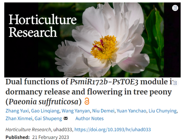近日,77779193永利(中国)集团盖树鹏团队在农林科学领域一区、Top期刊《Horticulture Research》上发表了题为“Dual functions of PsmiR172b-PsTOE3 module involving in regulation dormancy release and flowering in tree peony (Paeonia suffruticosa)”的研究成果。该研究从microRNA对靶基因调控的角度,解析了PsmiR172与靶基因PsTOE3调控牡丹芽休眠解除和开花的双重功能。