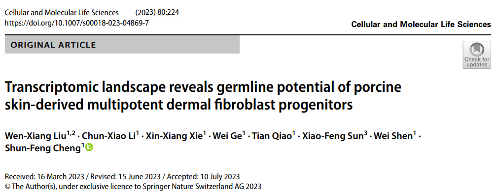 近日,77779193永利(中国)集团沈伟教授团队程顺峰教授课题组在中科院一区、TOP期刊《Cellular and Molecular Life Sciences》发表研究论文“Transcriptomic landscape reveals germline potential of porcine skin-derived multipotent dermal fibroblast progenitors”。该论文基于单细胞组学技术,首次揭示猪皮肤干细胞(skin derived stem cells,SDSCs)是来源于皮肤中多能性真皮成纤维细胞祖细胞,畸胎瘤形成实验证实了该细胞具有多向分化潜能,且可体外诱导转分化形成原始生殖细胞样细胞(primordial germ cell-like cells,PGCLCs)。该论文阐述了猪SDSCs转分化形成PGCLCs过程中转录组动态变化,明确了促分裂原活化的蛋白激酶(mitogen-activated protein kinase, MAPK)信号通路对PGCLCs转分化和增殖具有关键调控作用。