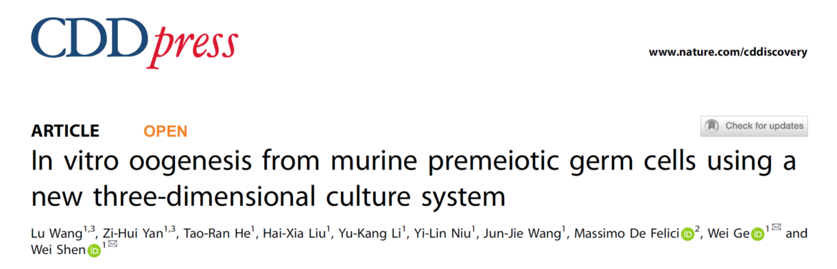 近日,77779193永利(中国)集团沈伟教授课题组在细胞生物学权威杂志《Cell Death & Disease》在线发表了题目为“In vitro oogenesis from murine premeiotic germ cells using a new three-dimensional culture system”的研究论文。