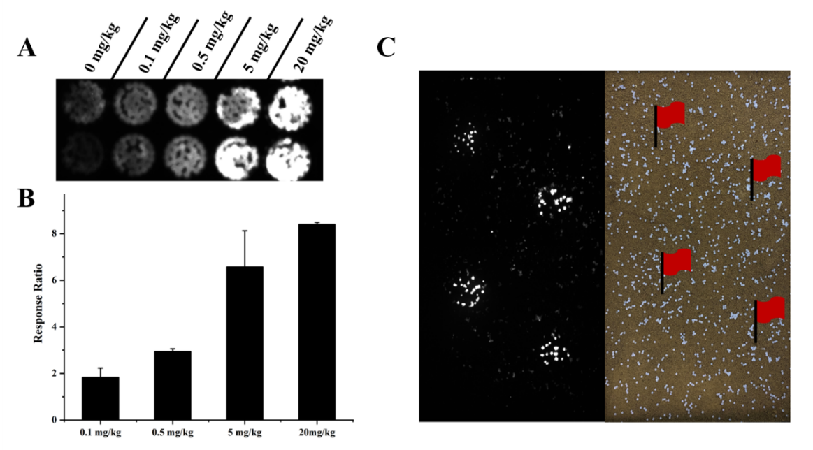 研究发现,恶臭假单胞菌(Pseudomonas putida)中的调控蛋白MexT能够通过与其下游基因启动子区结合实现对下游基因PP_2827转录的正向调控,且1,3-DNB能够增强这一调控,揭示了1,3-DNB参与MexT调控基因转录的机制,MexT调控蛋白也因此被确定为1,3-DNB生物传感器的基本传感元件。通过mexT基因和启动子不同组合优化,开发了基于MexT的1,3-DNB生物传感器,优化后的生物传感器在液相1,3-DNB 的检测灵敏度达到0.1 µg/mL,且具备优异的检测特异性和稳定性。进一步该生物传感器结合团队自行开发的探测装置集成了一套芳香族污染物分子生物传感系统(中国地眼,CEE,Fig. 1),以模拟芳香族污染物的现场探测:该系统对沙土中1,3-DNB的检测灵敏度为0.5 mg/kg土壤,实现了现场大面积检测和土壤掩埋1,3-DNB的准确定位(Fig. 2)。本研究提出了一种新的基于转录因子的生物传感器和一套完整的1,3-DNB高效检测系统。未来该1,3-DNB生物传感器可与之前报道的2,4-DNT生物传感器优势互补,实现对环境中的芳香族污染物分子进行更高效、更准确的探测。