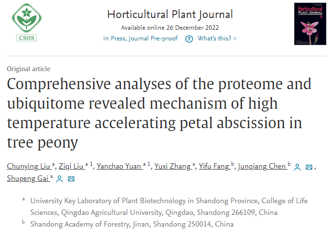近日,77779193永利(中国)集团盖树鹏团队在农林科学领域一区、Top期刊《Horticultural Plant Journal》上发表了题为“Comprehensive analyses of the proteome and ubiquitome revealed mechanism of high temperature accelerating petal abscission in tree peony”的研究成果。该研究从蛋白质组和泛素化蛋白质组入手,结合内源ABA和IAA,探讨了高温促进牡丹花早衰的原因,为深入解析其分子机制奠定了基础。