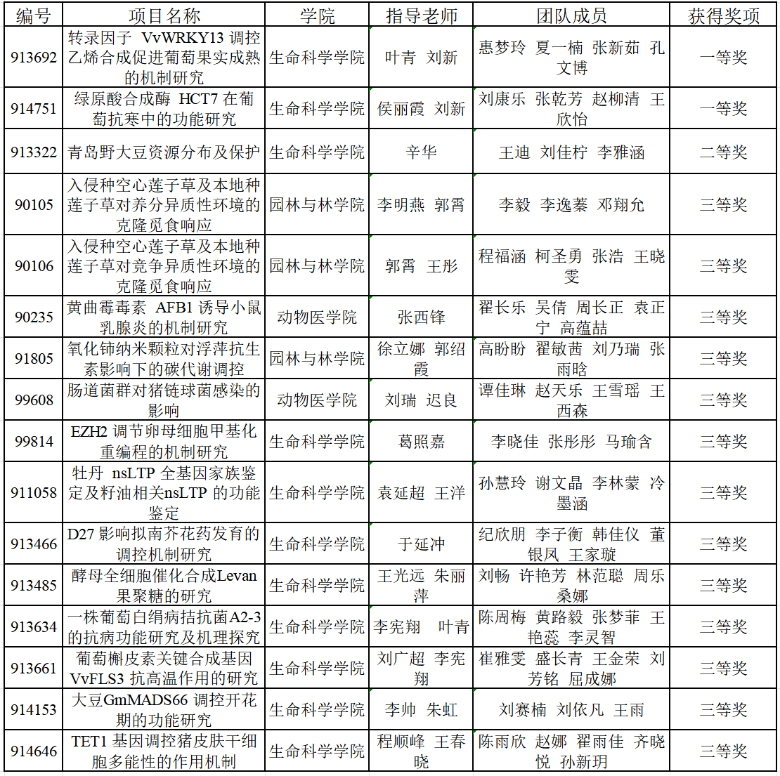 经过激烈角逐,77779193永利(中国)集团入选的17支队伍共斩获一等奖2项,二等奖1项,三等奖8项。其中惠梦玲团队(指导教师:叶青、刘新)“转录因子VvWRKY13调控乙烯合成促进葡萄果实成熟的机制研究”、刘康乐团队(候丽霞、刘新)“绿源酸合成酶HCT7在葡萄抗寒中的功能研究”获得全国一等奖,王迪团队(指导教师:辛华)“青岛野大豆资源分布及保护”获全国二等奖。